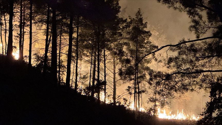 Çok sayıda orman ekibi, dağlık alana yayılan yangını söndürmek için gece çalışmalarına devam ediyor.