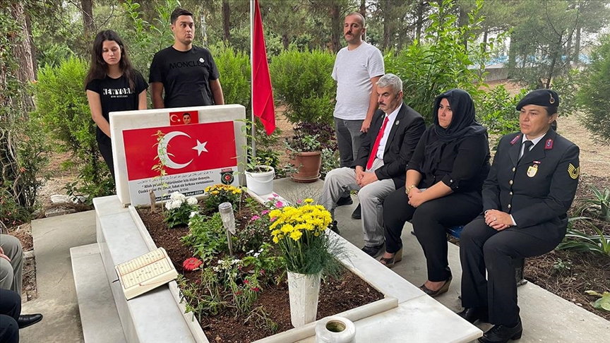 Şehidin Bekbele Mahallesi'ndeki mezarına giden eşi Cemile Gedik ve çocukları, buraya çiçek bıraktı.
