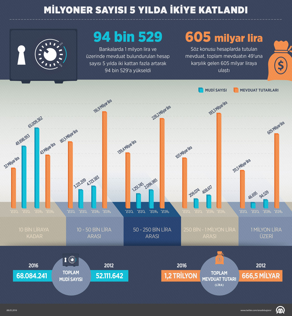 Bankalarda 1 milyon lira ve üzerinde mevduat bulundurulan hesap sayısı, 2012 yılı ilk çeyrekte 46 bin 695 iken, aradan geçen 5 yılda yüzde 102 artışla 94 bin 529'a yükseldi. Bu yılın ilk çeyreği itibarıyla 1 milyon lira ve üzerinde para bulunan mevduat hesaplarındaki toplam birikim 2012 yılının aynı dönemine göre yüzde 94,2 artarak 605 milyar liraya ulaştı. Milyoner hesaplarındaki mevduatın toplam mevduat içindeki payı yüzde 49 olarak hesaplandı. ( Grafik: Yasin Demirci - Anadolu Ajansı )08 Mayıs 2016•Güncelleme: 09 Mayıs 2016
