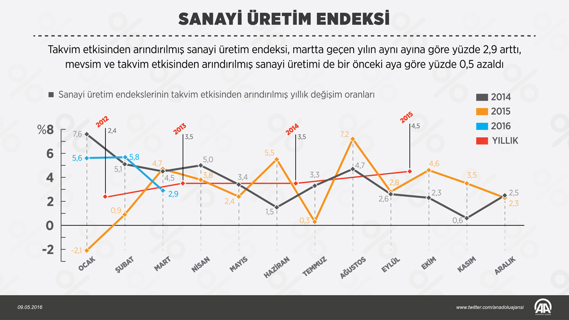 Takvim etkisinden arındırılmış sanayi üretim endeksi, martta geçen yılın aynı ayına göre yüzde 2,9 arttı, mevsim ve takvim etkisinden arındırılmış sanayi üretimi de bir önceki aya göre yüzde 0,5 azaldı. ( Ahmet Burak Özkan - Anadolu Ajansı )