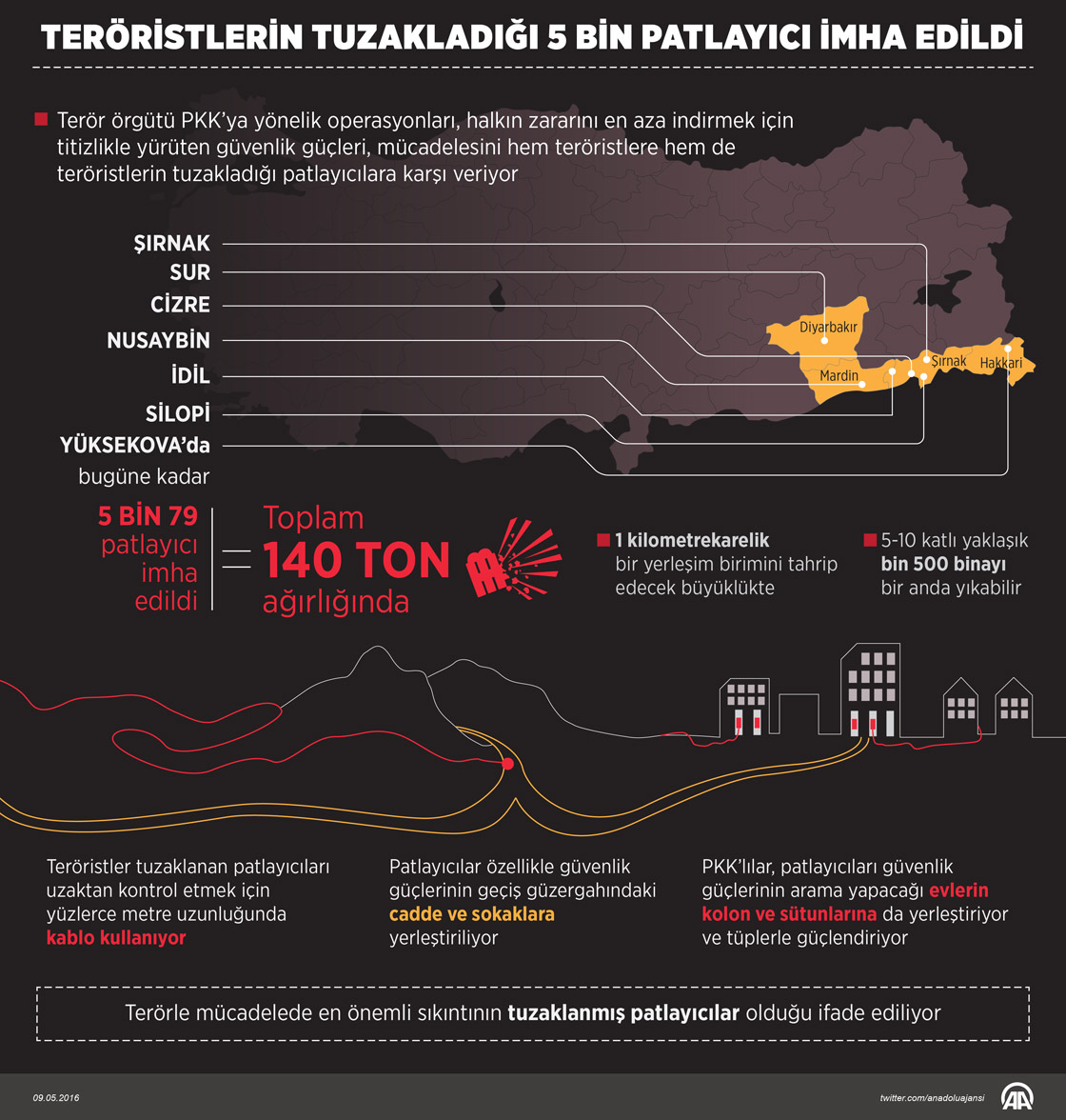 Terör örgütü PKK’ya yönelik operasyonları, halkın zararını en aza indirmek için titizlikle yürüten güvenlik güçleri, mücadelesini hem teröristlere hem de teröristlerin tuzakladığı patlayıcılara karşı veriyor. ( Murat Usubaliev - Anadolu Ajansı )09 Mayıs 2016•Güncelleme: 10 Mayıs 2016