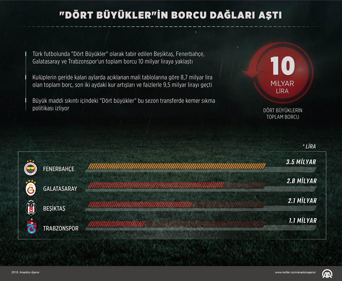 Türk futbolunda "Dört büyükler" olarak tabir edilen Beşiktaş, Fenerbahçe, Galatasaray ve Trabzonspor'un toplam borcu 10 milyar liraya yaklaştı. Kulüplerin geride kalan aylarda açıklanan mali tabloları ve başkanlarının beyanlarına göre 8,7 milyar lira olan toplam borç, son iki aydaki kur artışları ve faizlerle 9,5 milyar lirayı geçti. ( Kemal Delikmen - Anadolu Ajansı )25 Temmuz 2018•Güncelleme: 25 Temmuz 2018