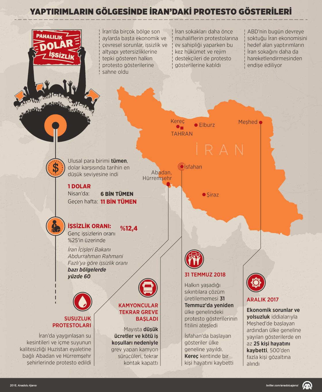 İran'da birçok bölge son aylarda başta ekonomik ve çevresel sorunlar, işsizlik ve altyapı yetersizliklerine tepki gösteren halkın protesto gösterilerine sahne olurken ABD'nin bugün devreye soktuğu İran ekonomisini hedef alan yaptırımların, İran sokağını daha da hareketlendirmesinden endişe ediliyor. ( Murat Usubaliev - Anadolu Ajansı )07 Ağustos 2018•Güncelleme: 07 Ağustos 2018