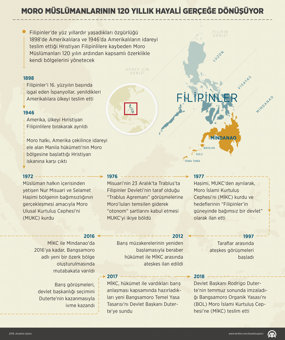 Filipinler’de yüzyıllardır sahip oldukları özgürlüğü önce 1898'de Amerikalılara ardından 1946’da Hrıstiyan Filipinlilere kaybeden Moro Müslümanları, imzalanan kapsamlı özerklik anlaşmasıyla 120 yıl sonra kendi bölgelerini yönetebilecek. ( Ahmet Burak Özkan - Anadolu Ajansı )07 Ağustos 2018•Güncelleme: 07 Ağustos 2018