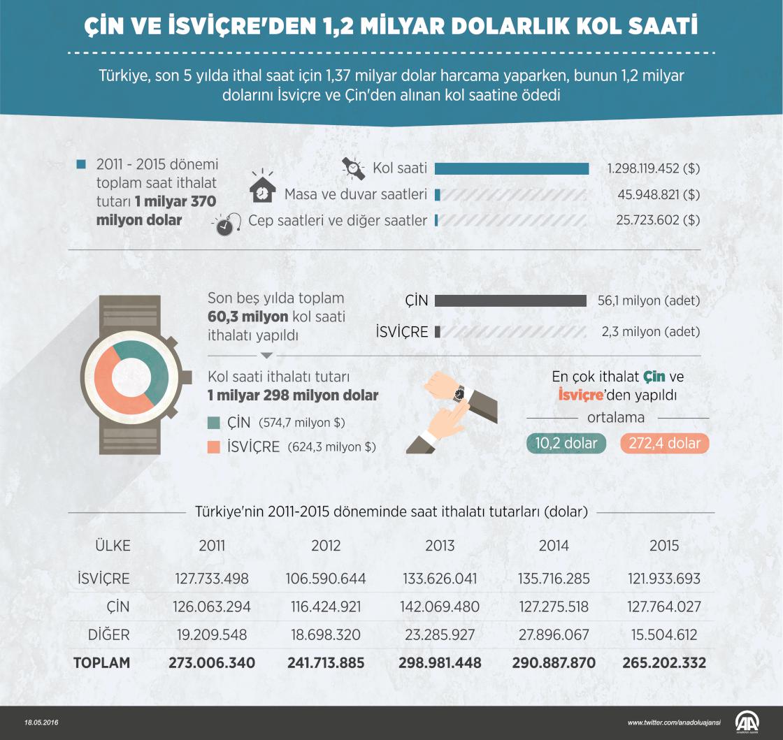 Türkiye'de 2011-2015 döneminde 1 milyar 370 milyon dolarlık saat ithal edildi. Bunlar arasında kol saatlerine harcanan tutar, 1 milyar 298 milyon dolar oldu. Bu dönemde 60 milyon 261 bin kol saati ithalatı gerçekleştirildi. Bunun 58 milyon 377 bini Çin ve İsviçre'den alındı. İthalat için söz konusu iki ülkeye toplam 1 milyar 265 milyon dolar ödendi. Bunun 1 milyar 199 milyon dolarını kol saatleri için ödenen tutar oluşturdu. ( Ahmet Burak Özkan - Anadolu Ajansı )18 Mayıs 2016•Güncelleme: 19 Mayıs 2016