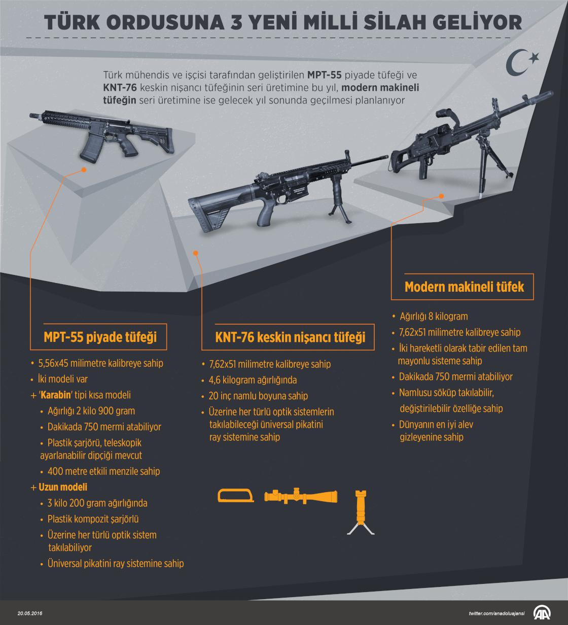 Türk mühendis ve işçisi tarafından geliştirilen ve dünyadaki emsallerinden çok daha üstün özelliklere sahip 3 farklı tip tüfeğin seri üretimi için çalışmalarda sona gelindi. Milli imkanlarla geliştirilen MPT-55 piyade tüfeği ve KNT-76 keskin nişancı tüfeğinin seri üretimine bu yıl, modern makineli tüfeğin seri üretimine ise gelecek yıl sonunda geçilmesi planlanıyor. ( Grafik: Murat Usubaliev - Anadolu Ajansı )20 Mayıs 2016•Güncelleme: 22 Mayıs 2016