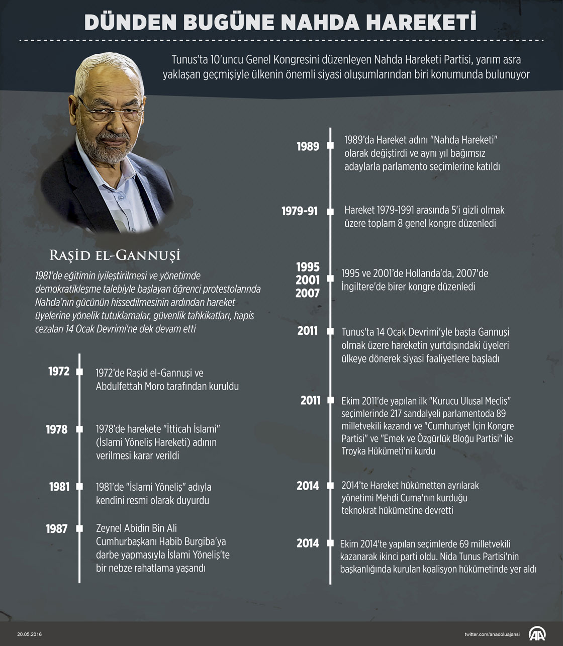Tunus'ta 10'uncu Genel Kongresini düzenleyen Nahda Hareketi Partisi, yarım asra yaklaşan geçmişiyle ülkenin önemli siyasi oluşumlarından biri konumunda bulunuyor ( Grafik: Muhammed Ali Yiğit - Anadolu Ajansı )