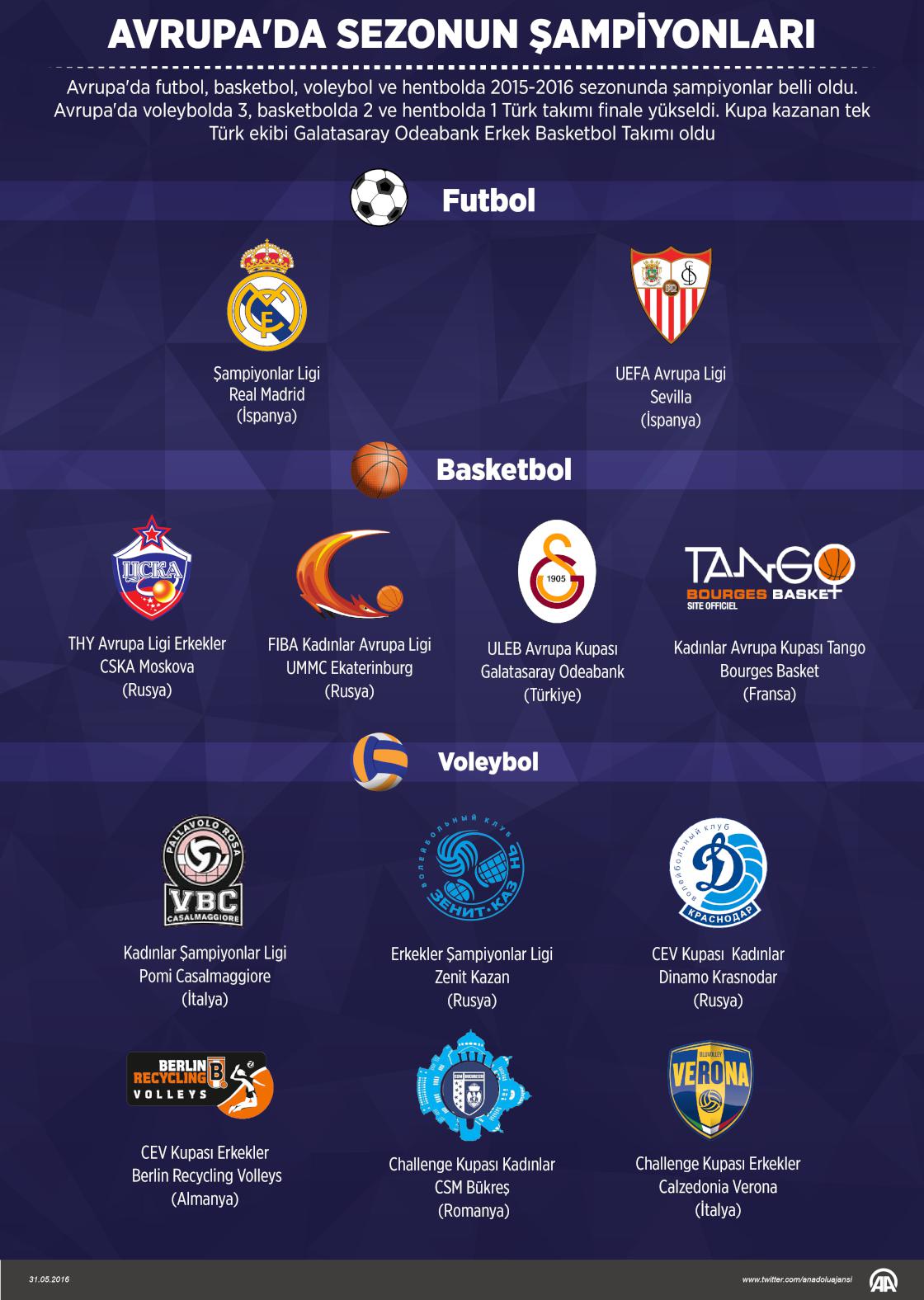 Avrupa'da futbol, basketbol, voleybol ve hentbolda 2015-2016 sezonunda şampiyonlar belli oldu. Avrupa'da voleybolda 3, basketbolda 2 ve hentbolda 1 Türk takımı finale yükseldi. Kupa kazanan tek Türk ekibi Galatasaray Odeabank Erkek Basketbol Takımı oldu ( Muhammed Ali Yiğit - Anadolu Ajansı )31 Mayıs 2016•Güncelleme: 01 Haziran 2016