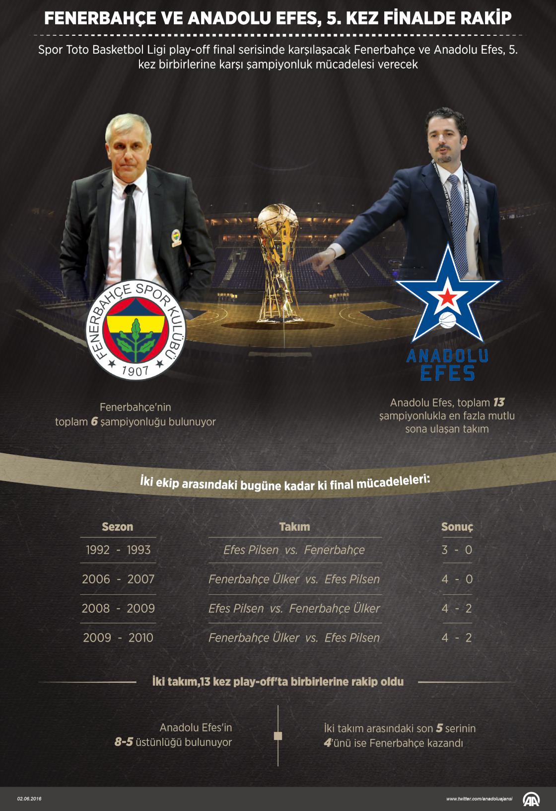 Basketbolda 50. sezonun şampiyonunun belirleneceği play-off serisinde karşılaşacak Fenerbahçe ve Anadolu Efes, daha önce 4 kez şampiyonluk için birbirlerine finalde rakip oldu. Bu 4 finalde iki takımda ikişer kez birbirlerine üstünlük sağlayarak kupayı müzeleri götürdü. ( Muhammed Ali Yiğit - Anadolu Ajansı )02 Haziran 2016•Güncelleme: 03 Haziran 2016