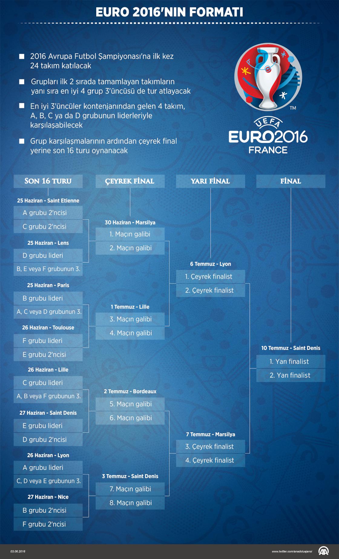 2016 Avrupa Futbol Şampiyonası'na ilk kez 24 takım katılacak. Grupları ilk 2 sırada tamamlayan takımların yanı sıra en iyi 4 grup 3'üncüsü de tur atlayacak. En iyi 3'üncüler kontenjanından gelen 4 takım, A, B, C ya da D grubunun liderleriyle karşılaşabilecek. Grup karşılaşmalarının ardından çeyrek final yerine son 16 turu oynanacak.