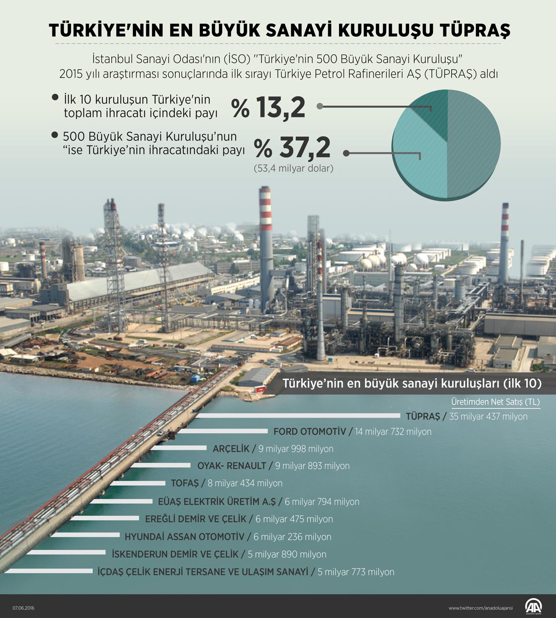 İstanbul Sanayi Odasının (İSO) ''Türkiye'nin 500 Büyük Sanayi Kuruluşu" 2015 yılı araştırması sonucunda ilk sırada Türkiye Petrol Rafinerileri AŞ (TÜPRAŞ) yer alırken, Ford Otomotiv Sanayi AŞ ikinci, Arçelik üçüncü oldu. (Gözde Gültekinler - Anadolu Ajansı)07 Haziran 2016•Güncelleme: 08 Haziran 2016