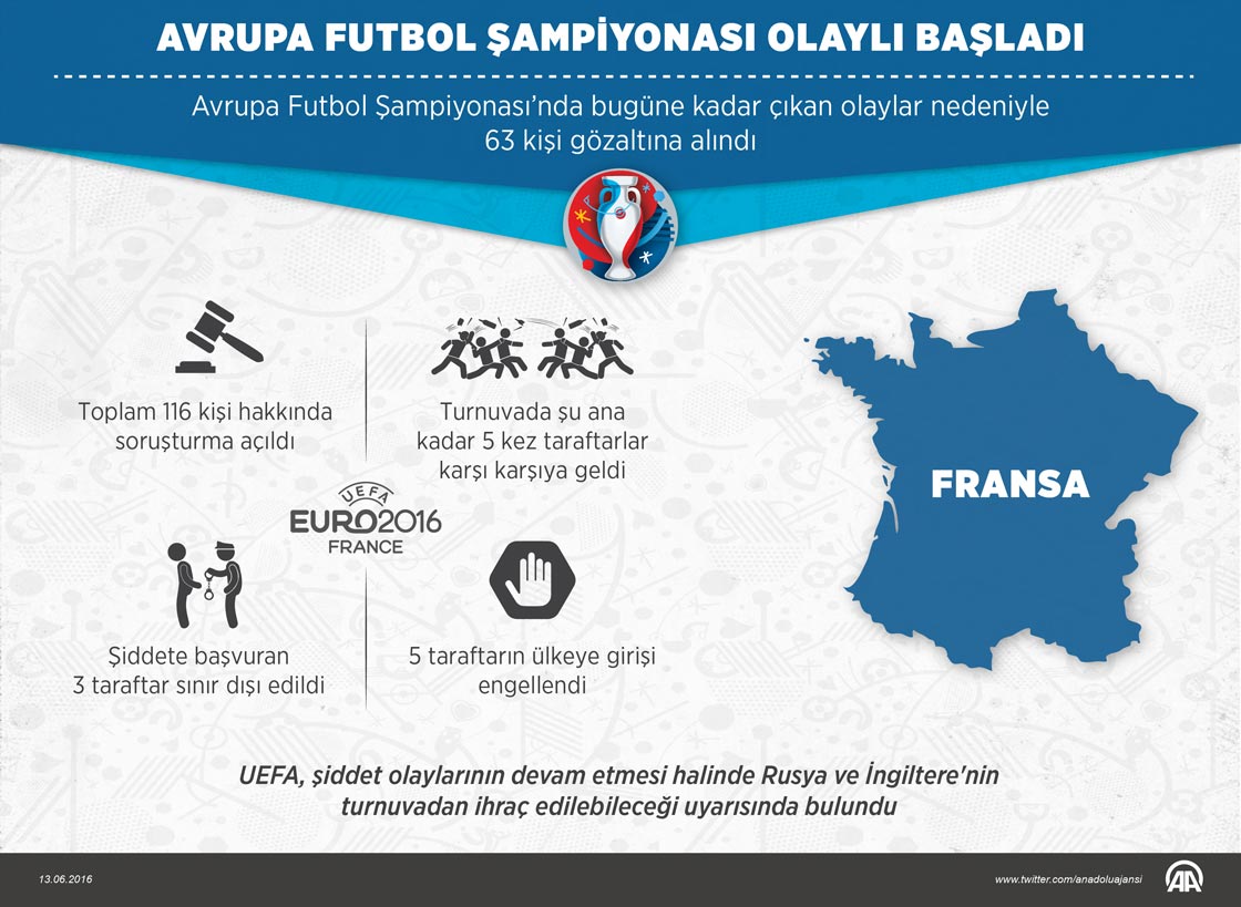 Fransa'da 10 Haziran'da başlayan 2016 Avrupa Futbol Şampiyonası (EURO 2016), sportif yönünden çok saha dışındaki olaylarla gündeme geldi. (Grafik: Kemal Delikmen - Anadolu Ajansı)