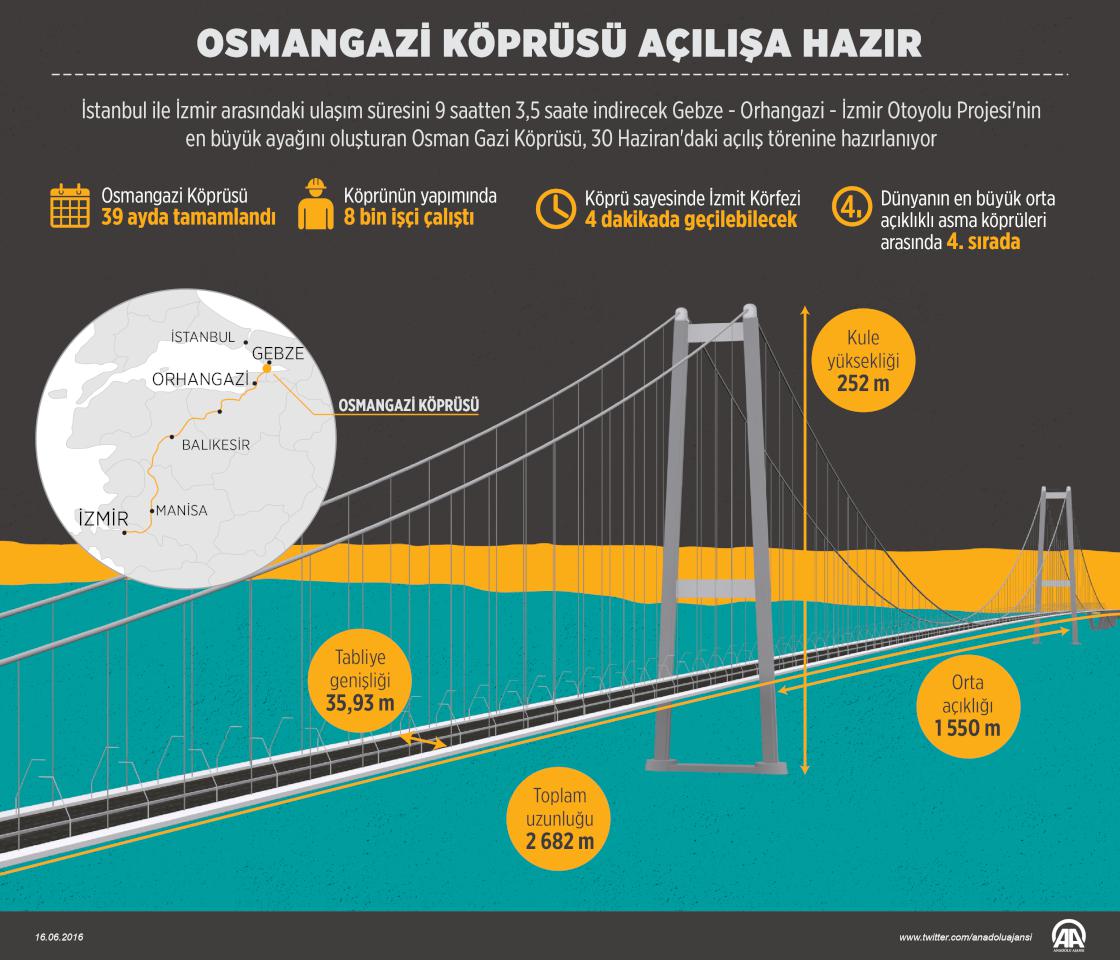 Cumhurbaşkanı Recep Tayyip Erdoğan ve Başbakan Binali Yıldırım'ın katılacağı törenle 30 Haziran'da açılması planlanan, dünyanın en büyük orta açıklıklı asma köprüleri arasında 4. sırada yer alan Osmangazi Köprüsü, yaklaşık 39 ayda tamamlandı. 252 metre kule yüksekliğine, 35,93 metre tabliye genişliğine, bin 550 metre orta açıklığına ve 2 bin 682 metre uzunluğa sahip köprünün yapımında 8 bin işçi çalıştı. İstanbul ile İzmir arasındaki ulaşım süresini 9 saatten 3,5 saate indirecek Gebze-Orhangazi-İzmir Otoyolu Projesi'nin en büyük ayağını oluşturan köprü sayesinde İzmit Körfezi 4 dakikada geçilebilecek. ( Grafik: Murat Usubaliev - Anadolu Ajansı )16 Haziran 2016•Güncelleme: 18 Haziran 2016