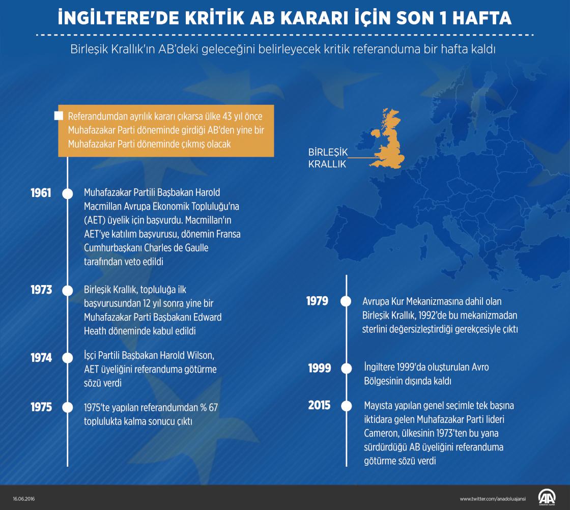 Birleşik Krallık'ın AB’deki geleceğini belirleyecek kritik referanduma bir hafta kaldı. Referandumdan ayrılık kararı çıkarsa ülke 43 yıl önce Muhafazakar Parti döneminde girdiği AB'den yine bir Muhafazakar Parti döneminde çıkmış olacak. ( Grafik: Muhammed Ali Yiğit - Anadolu Ajansı )16 Haziran 2016•Güncelleme: 19 Haziran 2016