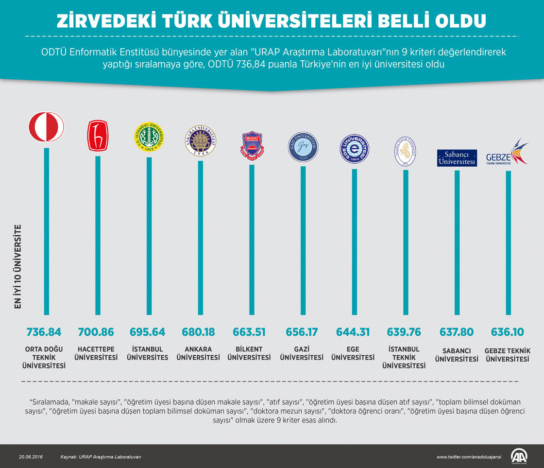 ODTÜ Enformatik Enstitüsü bünyesinde yer alan "URAP Araştırma Laboratuvarı"nın 9 kriteri değerlendirerek yaptığı sıralamaya göre, Ortadoğu Teknik Üniversitesi Türkiye'nin en iyi üniversitesi oldu. ODTÜ'yü Hacettepe, İstanbul, Ankara, Bilkent, Gazi, Ege, İstanbul Teknik, Sabancı, Gebze Teknik, Koç, Atatürk, Erciyes, Marmara ve Selçuk üniversiteleri izledi. (Grafik: Murat Usubaliev - Anadolu Ajansı)20 Haziran 2016•Güncelleme: 21 Haziran 2016