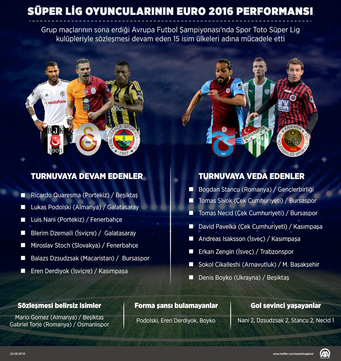 Grup maçlarının sona erdiği Avrupa Futbol Şampiyonası'nda Spor Toto Süper Lig kulüpleriyle sözleşmesi devam eden 15 isim ülkeleri adına mücadele etti.