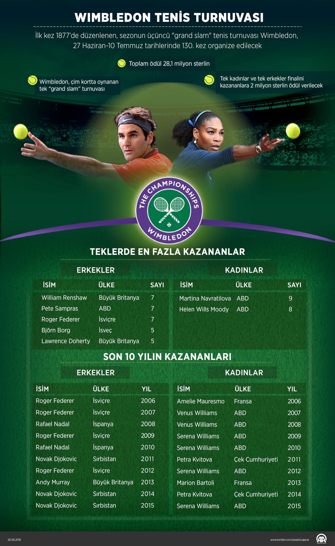 Çim kortta oynanan tek grand slam özelliğini taşıyan Wimbledon Tenis Turnuvası yarın başlayacak Kariyerinin 2'nci grand slam deneyimini yaşayacak Çağla Büyükakçay, ilk turda 30 numaralı seribaşı Fransız Garcia ile karşılaşacak Erkeklerin 1 numaralı seribaşı Djokovic, 2016'nın kalan 2 turnuvası Wimbledon ve ABD Açık'ta şampiyon olması halinde, aynı takvim yılındaki tüm grand slamleri kazanan 3. erkek tenisçi olacak Tek kadınlarda 1 numaralı seribaşı Serena Williams, burada 7. kez zafere ulaşması durumunda, 22 şampiyonlukla "açık dönemde en fazla grand slam turnuvası kazanan tenisçi" unvanını Steffi Graf ile paylaşacak