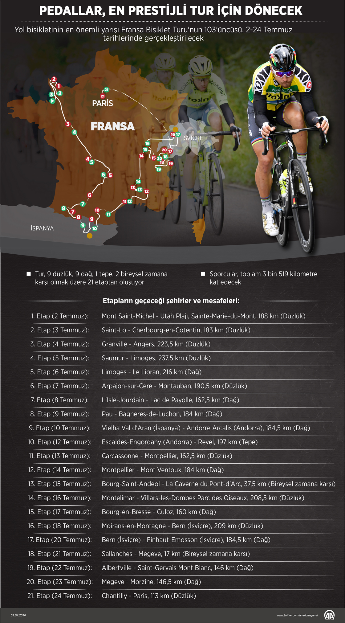 Yol bisikletinin en önemli yarışı Fransa Bisiklet Turu'nun 103'üncüsü, 2-24 Temmuz tarihlerinde gerçekleştirilecek. Tur, 9 düzlük, 9 dağ, 1 tepe, 2 bireysel zamana karşı olmak üzere 21 etaptan oluşuyor . Sporcular, toplam 3 bin 519 kilometre kat edecek. ( Muhammed Ali Yiğit - Anadolu Ajansı )01 Temmuz 2016•Güncelleme: 03 Temmuz 2016