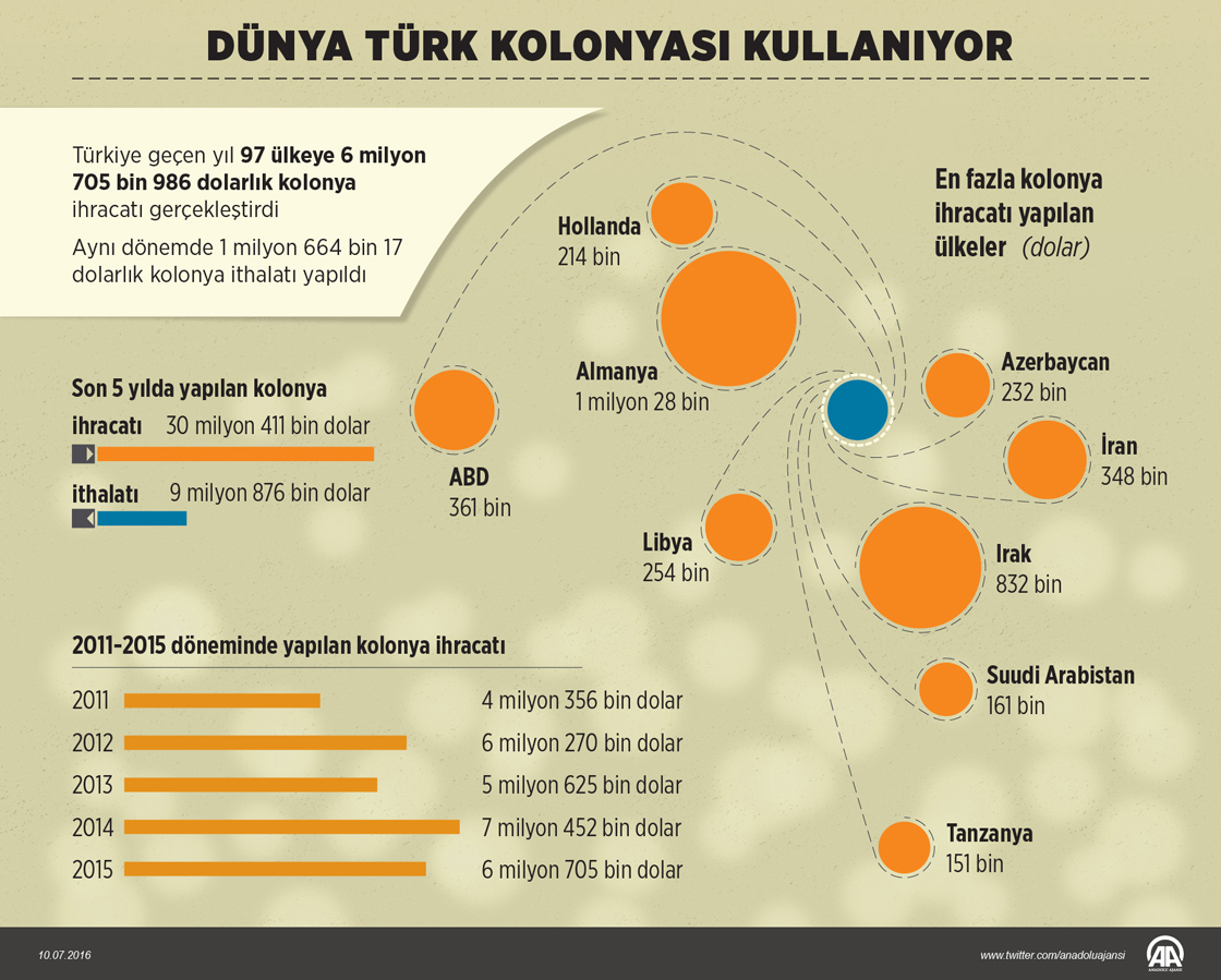 Geçen yıl 97 ülkeye kolonya ihraç edilirken, dünyada Türk kolonyasından elde edilen gelir, son 5 yılda 30 milyon doları geçti. (Grafik: Murat Usubaliev - Anadolu Ajansı)