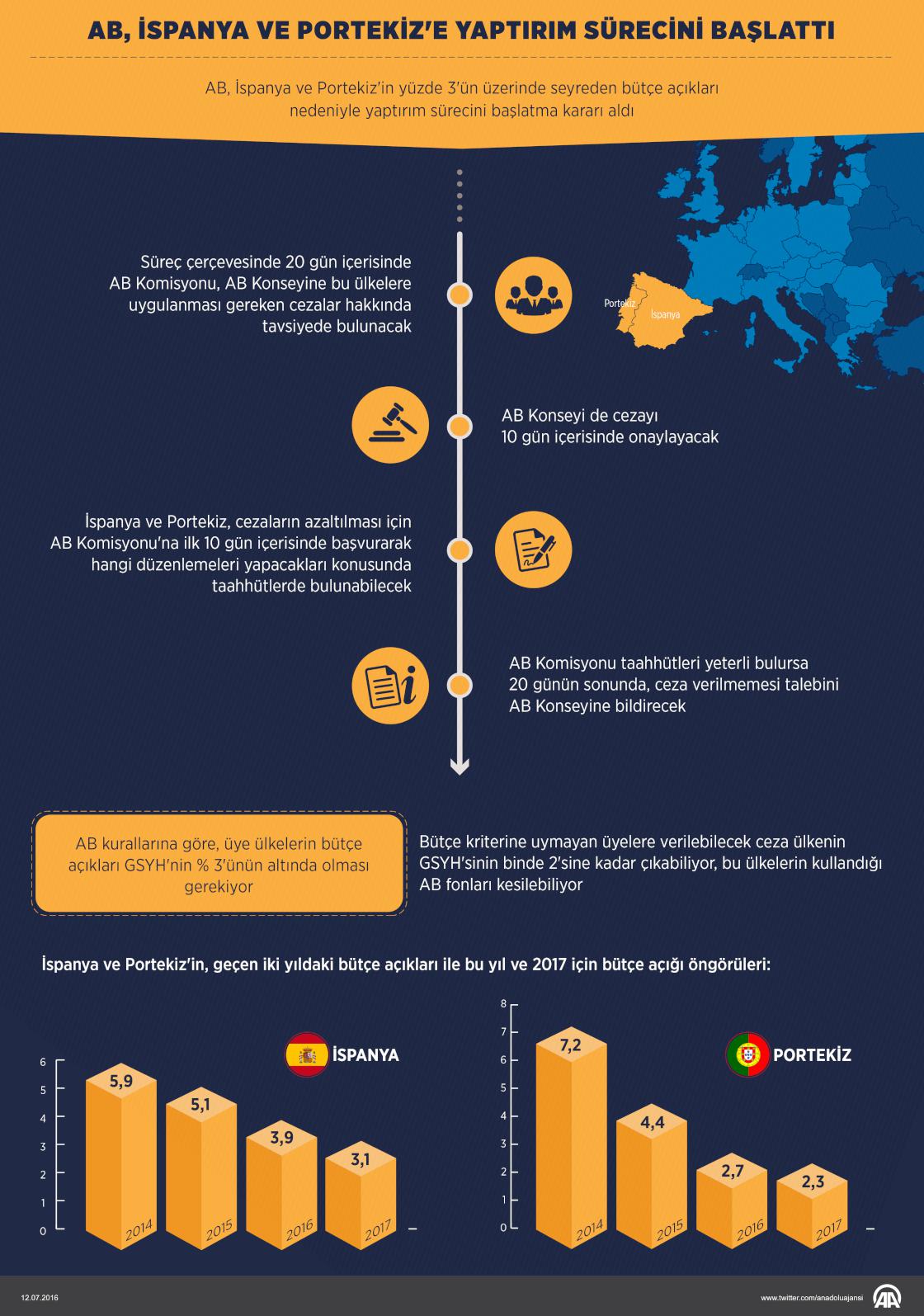 AB, İspanya ve Portekiz'in yüzde 3'ün üzerinde seyreden bütçe açıkları nedeniyle yaptırım sürecini başlatma kararı aldı. AB kurallarına göre bütçe kriterine uymayan üyelere verilebilecek ceza ülkenin GSYH'sinin binde 2'sine kadar çıkabiliyor. Ceza kapsamında bu ülkelerin kullandığı AB yardımları ve fonları da kesilebiliyor. ( Yasin Demirci - Anadolu Ajansı )12 Temmuz 2016•Güncelleme: 13 Temmuz 2016