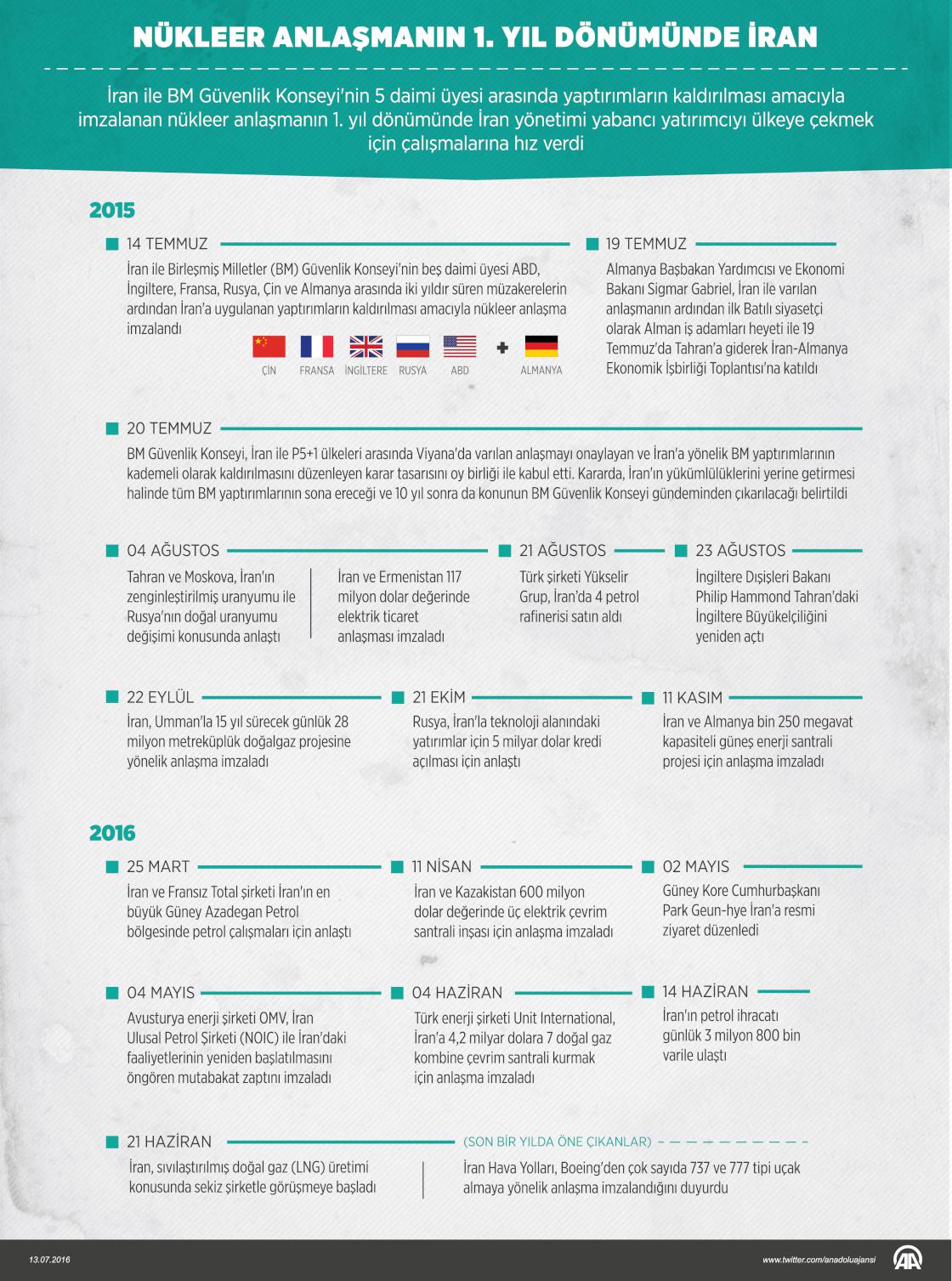 İran ile Birleşmiş Milletler (BM) Güvenlik Konseyi'nin 5 daimi üyesi ABD, İngiltere, Fransa, Rusya, Çin ve Almanya arasında iki yıldır süren müzakerelerin ardından 14 Temmuz 2015'te imzalanan nükleer anlaşmayla, son 6 aydır İran'a uygulanan ekonomik ve mali yaptırımlar da kademeli olarak kaldırılmaya başladı ve ülke uluslararası yatırımcı için dikkati çeken bir pazar haline geldi. ( Ahmet Burak Özkan - Anadolu Ajansı )13 Temmuz 2016•Güncelleme: 14 Temmuz 2016