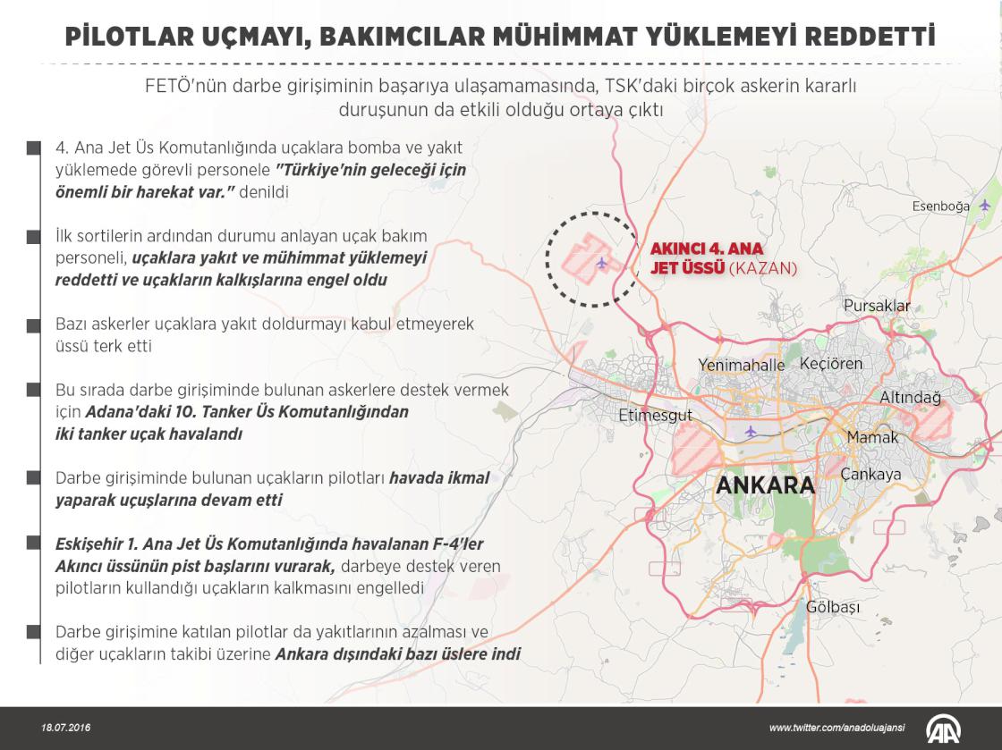 Fetullahçı Terör Örgütü'nün (FETÖ) darbe girişimine engel olmak isteyen bazı askerlerin Ankara'yı vuran uçaklara yakıt ve mühimmat yüklemeyi reddettikleri, çeşitli bahanelerle uçakların kalkışlarına engel olmaya çalıştıkları ortaya çıktı. Darbe girişimine katılmak istemeyen bir pilot darp edilirken bazı pilotlar ise üsten kaçtı. ( Grafik: Kemal Delikmen - Anadolu Ajansı )18 Temmuz 2016•Güncelleme: 19 Temmuz 2016