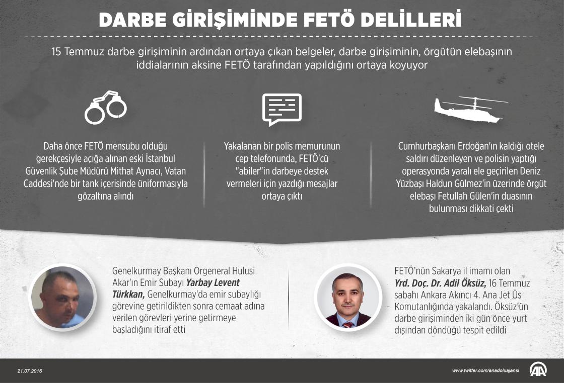 Milleti ve iradesini hedef alan 15 Temmuz darbe girişiminin ardından ortaya çıkan belgeler, darbe girişiminin, örgüt elebaşısının iddialarının aksine Fetullahçı Terör Örgütü (FETÖ) tarafından yapıldığını kanıtlayacak izler taşıyor. ( Grafik: Kemal Delikmen - Anadolu Ajansı )21 Temmuz 2016•Güncelleme: 22 Temmuz 2016