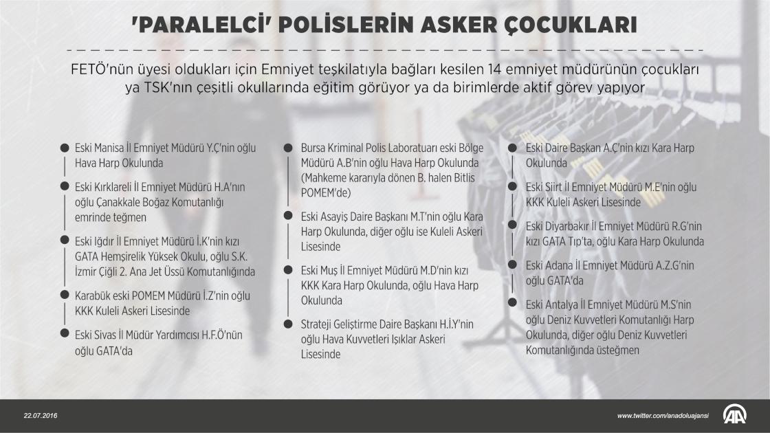 Terör örgütü FETÖ'nün üyesi oldukları yönündeki tespitler nedeniyle Emniyet teşkilatıyla bağları kesilen 14 emniyet müdürünün çocukları ya TSK'nın çeşitli okullarında eğitim görüyor ya da buradaki birimlerde aktif görev yapıyor. ( GRAFİK: Ahmet Burak Özkan - Anadolu Ajansı )22 Temmuz 2016•Güncelleme: 25 Temmuz 2016