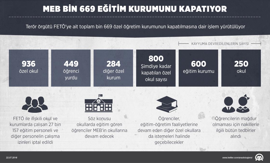 Milli Eğitim Bakanlığınca (MEB), Anayasal düzene karşı işlenen suçlar kapsamında terör örgütü FETÖ'ye ait 936'sı özel okul, 449'u öğrenci yurdu, 284'ü diğer özel kurum olmak üzere toplam bin 669 özel öğretim kurumunun kapatılmasına dair işlem yürütülüyor. ( Yasin Demirci - Anadolu Ajansı )22 Temmuz 2016•Güncelleme: 25 Temmuz 2016