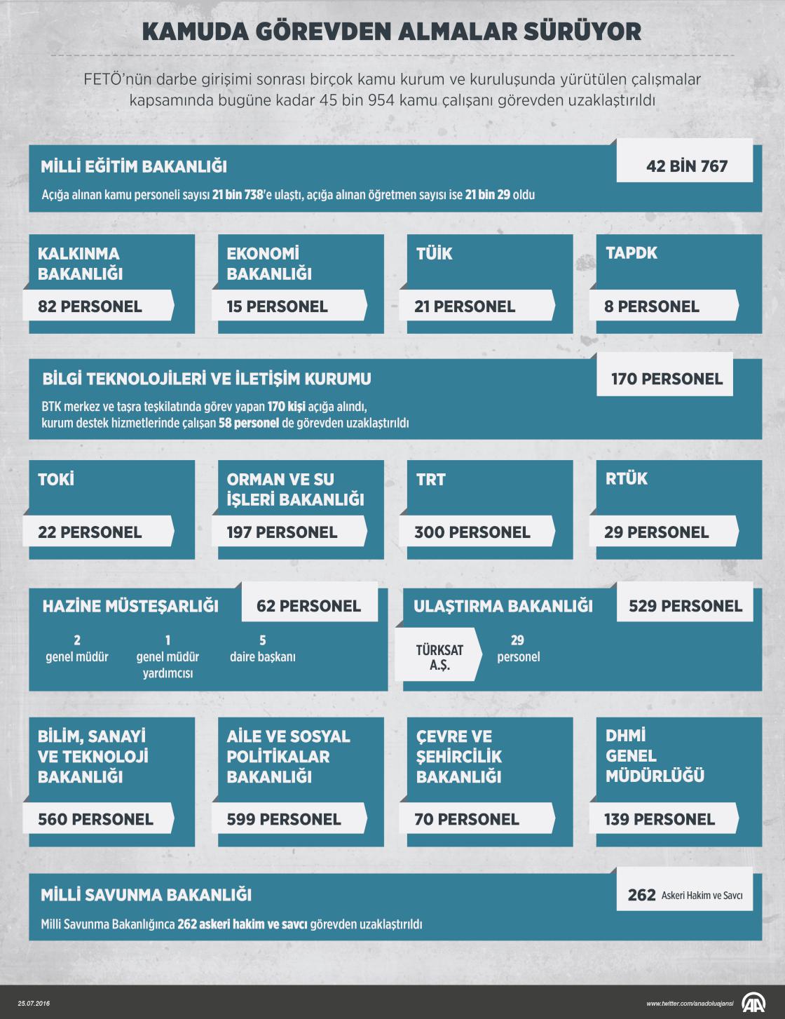 Fetullahçı Terör Örgütünün (FETÖ) darbe girişimi sonrası birçok kamu kurum ve kuruluşunda yürütülen çalışmalar kapsamında bugüne kadar 45 bin 954 personel görevden uzaklaştırıldı. ( Ahmet Burak Özkan - Anadolu Ajansı )