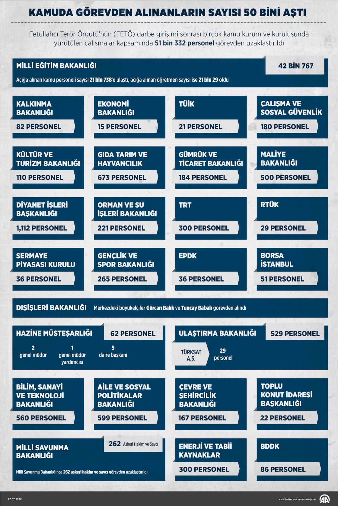 Fetullahçı Terör Örgütü'nün (FETÖ) darbe girişimi sonrası birçok kamu kurum ve kuruluşunda yürütülen çalışmalar kapsamında 51 bin 332 personel görevden uzaklaştırıldı. Çalışma ve Sosyal Güvenlik Bakanlığı başta olmak üzere ekonomiyle ilgili kurum ve kuruluşlarda ise 15 Temmuz'dan bugüne kadar toplam 5 bin 412 personel açığa alındı.27 Temmuz 2016•Güncelleme: 28 Temmuz 2016