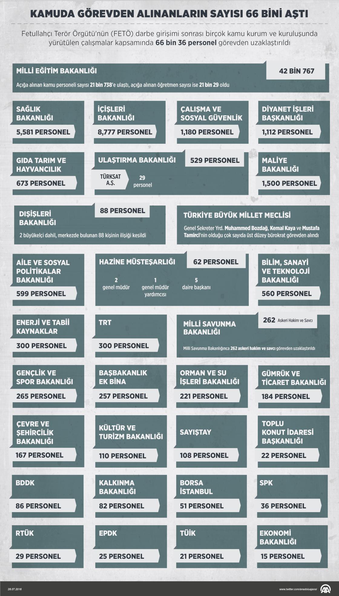 Fetullahçı Terör Örgütü'nün (FETÖ) darbe girişimi sonrası birçok kamu kurum ve kuruluşunda yürütülen çalışmalar kapsamında 66 bin 36 personel görevden uzaklaştırıldı.