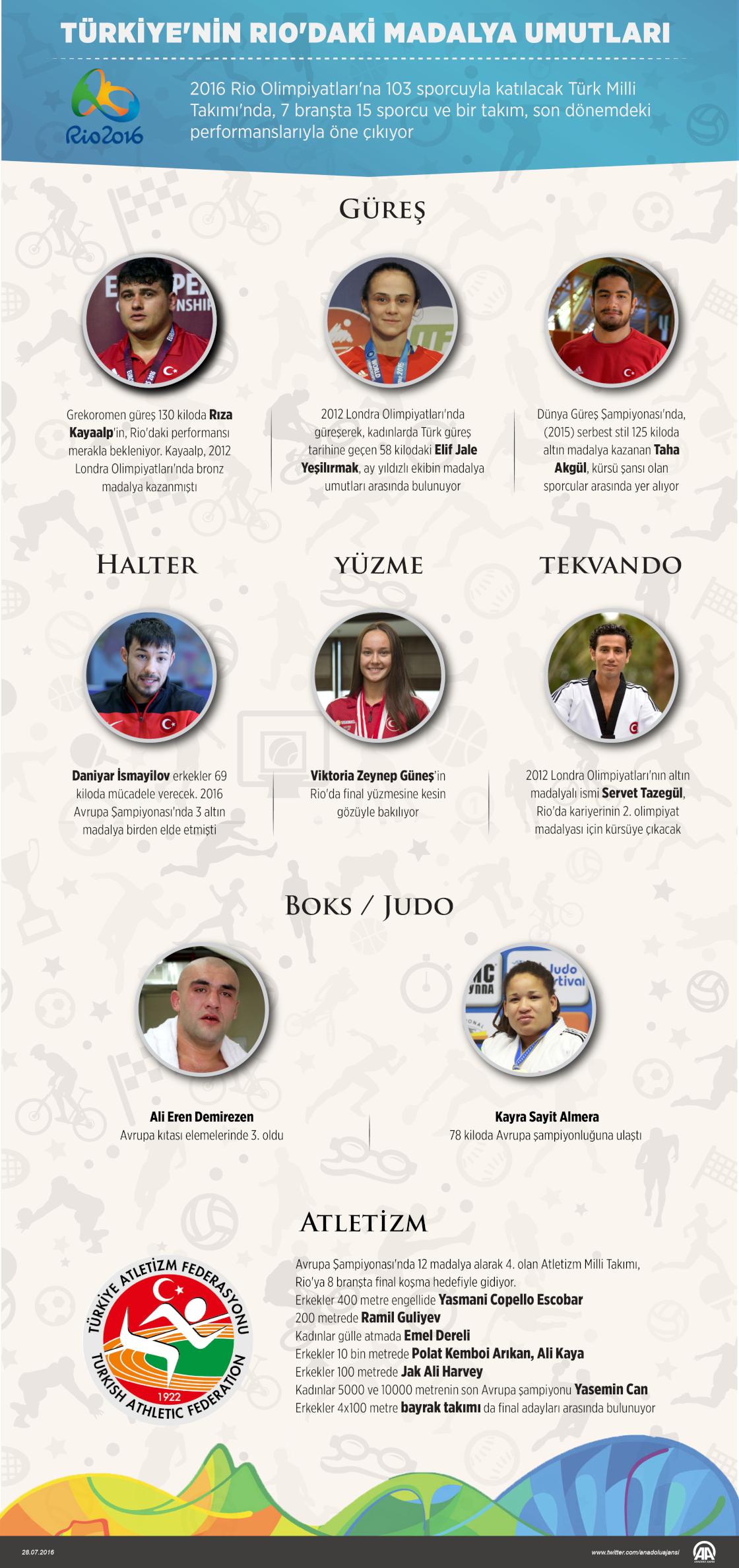2016 Rio Olimpiyatları'na 103 sporcuyla katılacak Türk Milli Takımı'nda, 7 branşta 15 sporcu ve bir takım, son dönemdeki performanslarıyla öne çıkıyor. ( Grafik: Muhammed Ali Yiğit - Anadolu Ajansı )