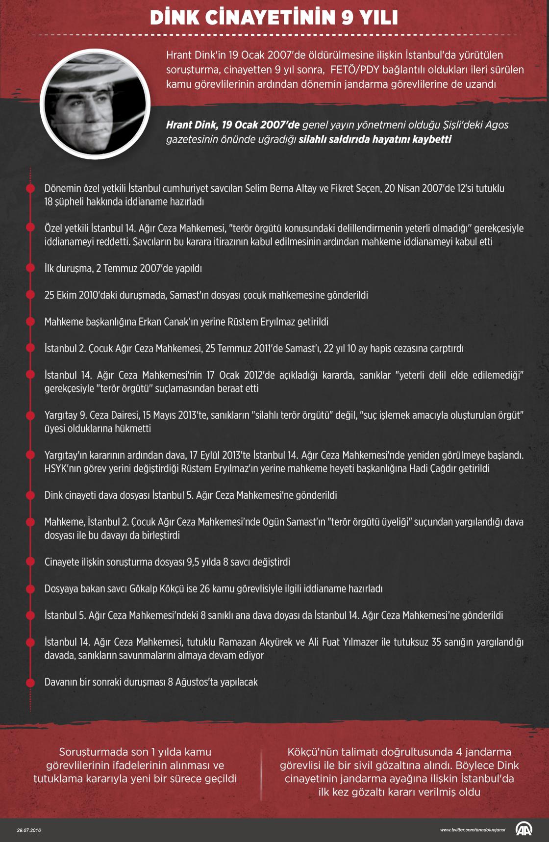 Agos Gazetesi Genel Yayın Yönetmeni Hrant Dink'in 19 Ocak 2007'de öldürülmesine ilişkin İstanbul Cumhuriyet Başsavcılığınca yürütülen soruşturma, cinayetten 9 yıl sonra, ana dava dosyasındaki sanıklarla birlikte yargılanmasına başlanan ve FETÖ/PDY bağlantılı oldukları ileri sürülen kamu görevlilerinin ardından dönemin jandarma görevlilerine de uzandı. ( Kemal Delikmen - Anadolu Ajansı )29 Temmuz 2016•Güncelleme: 31 Temmuz 2016