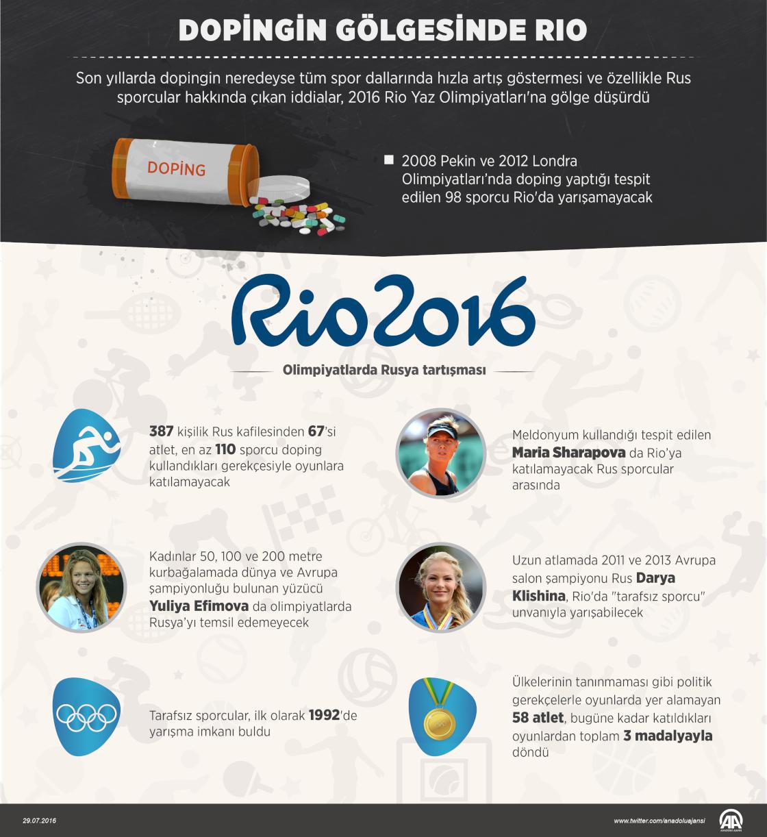 Son yıllarda dopingin neredeyse tüm spor dallarında hızla artış göstermesi ve özellikle Rus sporcular hakkında çıkan iddialar, Brezilya'nın Rio de Janeiro kentinde 5-21 Ağustos tarihleri arasında düzenlenecek 2016 Rio Yaz Olimpiyatları'na gölge düşürdü. 2008'de Pekin'de ve 2012'de Londra'da düzenlenen olimpiyat oyunlarında doping yaptığı tespit edilen 98 sporcu da Rio'da yarışamayacak. ( Muhammed Ali Yiğit - Anadolu Ajansı )29 Temmuz 2016•Güncelleme: 31 Temmuz 2016