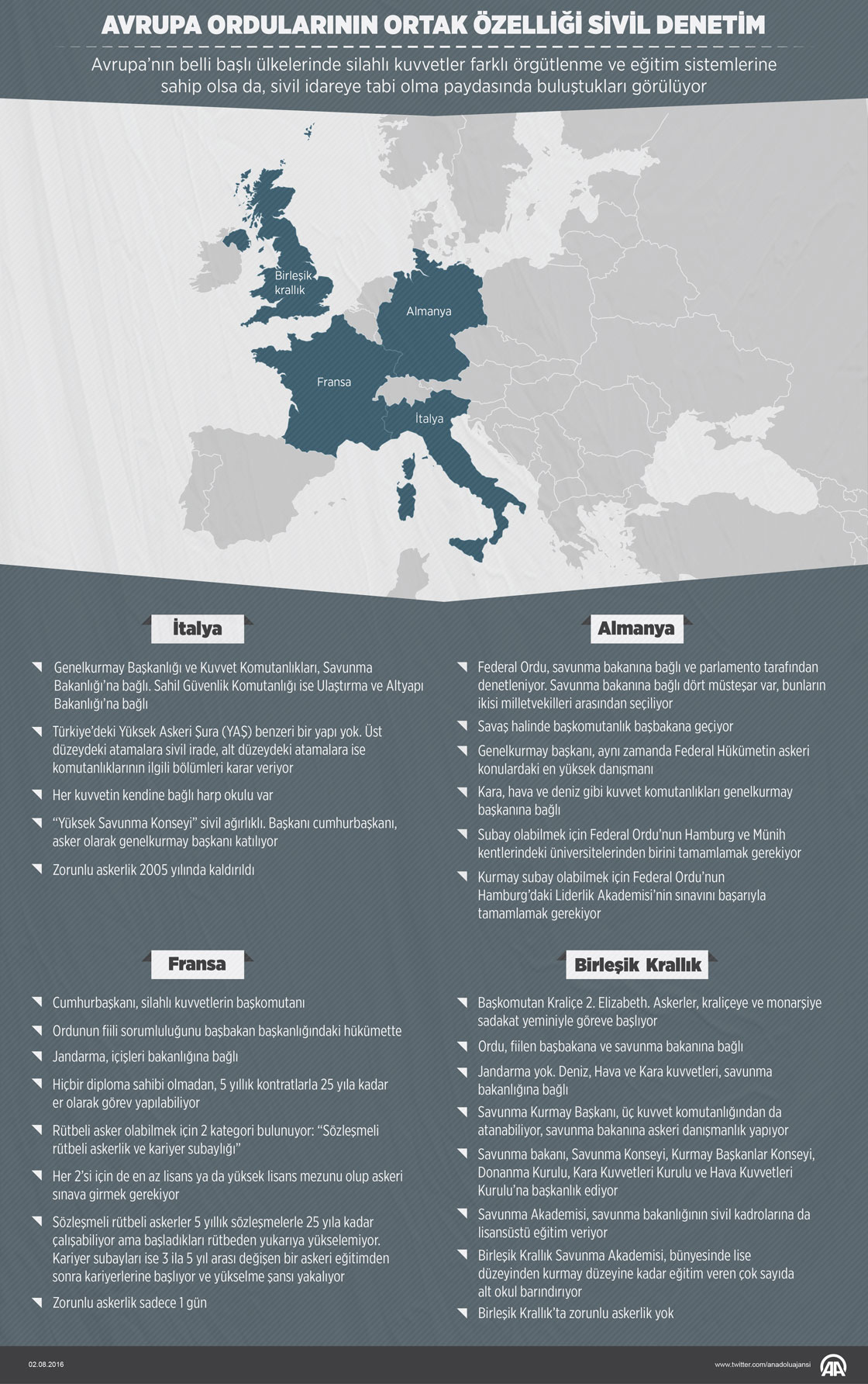 Avrupa’nın belli başlı ülkelerinde silahlı kuvvetler farklı örgütlenme ve eğitim sistemlerine sahip olsa da, sivil idareye tabi olma paydasında buluştukları görülüyor. ( Grafik: Muhammed Ali Yiğit - Anadolu Ajansı )