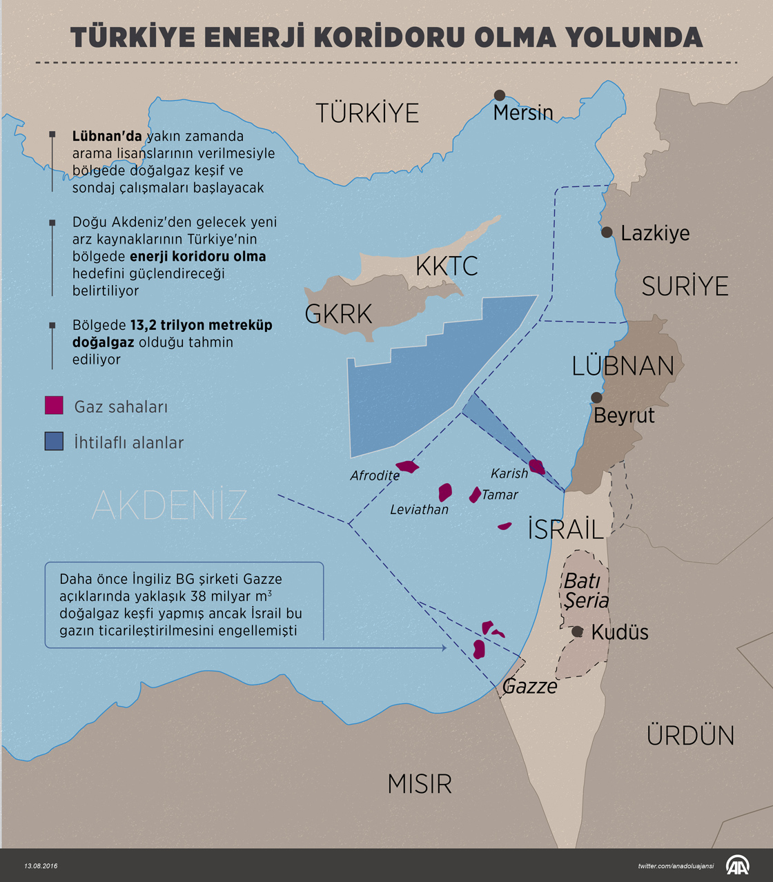 Doğu Akdeniz'de İsrail ve Güney Kıbrıs Rum Yönetimi'nin doğalgaz keşiflerinin ardından Lübnan'ın da bölgede yapacağı arama çalışmalarının Türkiye'nin bölgede enerji koridoru olma hedefini güçlendireceği belirtildi. ( Murat Usubaliev - Anadolu Ajansı )
