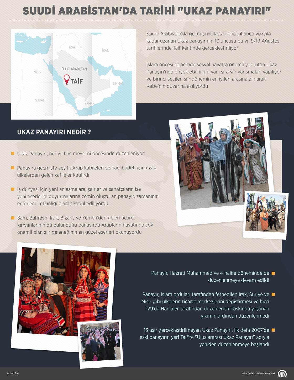 Suudi Arabistan'da geçmişi millattan önce 4'üncü yüzyıla kadar uzanan Ukaz panayırının 10'uncusu bu yıl 9/19 Ağustos tarihlerinde Taif kentinde gerçekleştiriliyor. İslam öncesi dönemde sosyal hayatta önemli yer tutan Ukaz Panayırı'nda birçok etkinliğin yanı sıra şiir yarışmaları yapılıyor ve birinci seçilen şiir dönemin en iyileri arasına alınarak Kabe'nin duvarına asılıyordu. ( Yasin Demirci - Anadolu Ajansı )16 Ağustos 2016•Güncelleme: 17 Ağustos 2016