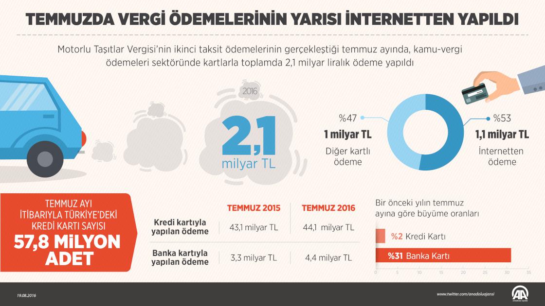 Kredi kartları ile kamu-vergi ödemelerinde geçen ay 2,1 milyar TL'lik ödeme yapılırken, bu tutarın yarısı internetten gerçekleştirildi. ( Yasin Demirci - Anadolu Ajansı )