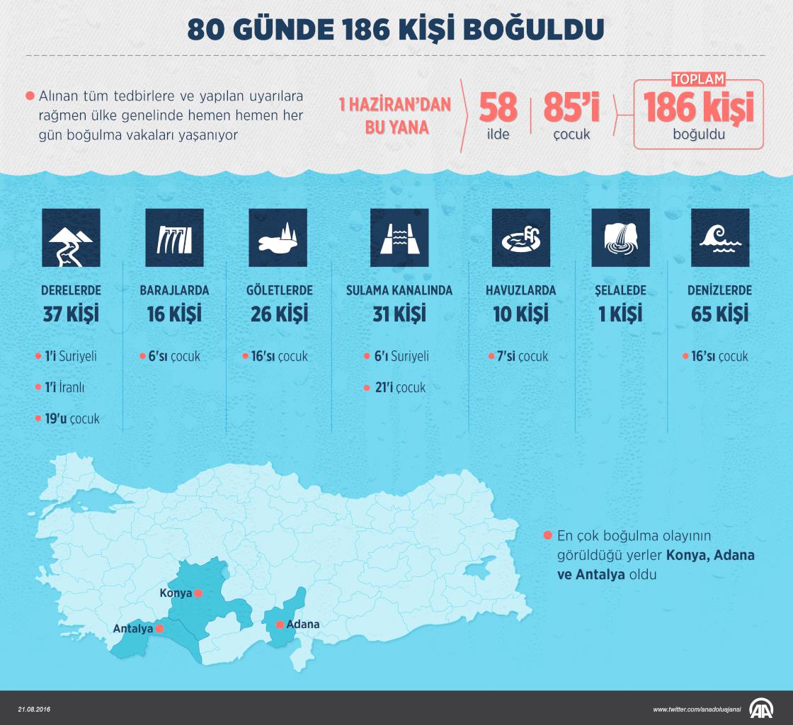 Yurt genelinde etkili olan sıcaklardan bunalanların serinlemek için girdikleri deniz, göl ve kanal gibi yerlerde 80 günde 85'i çocuk 186 kişi yaşamını yitirdi. ( Yasin Demirci - Anadolu Ajansı )