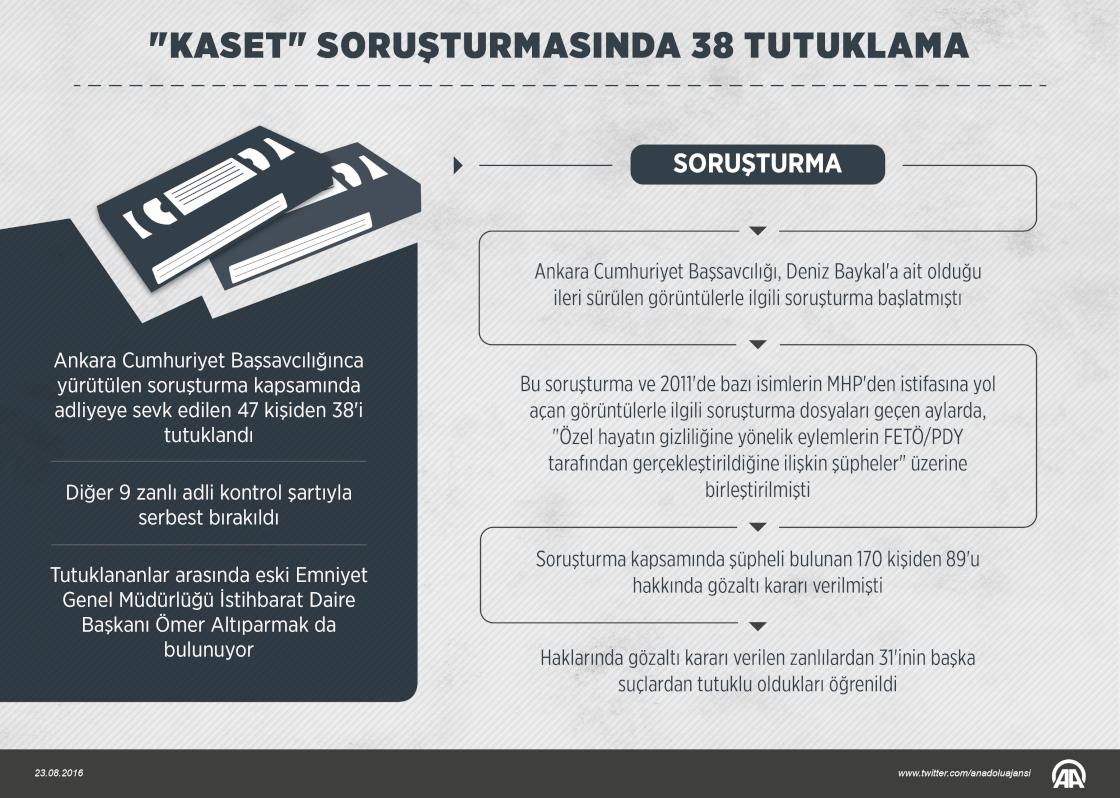 CHP Antalya Milletvekili Deniz Baykal ve bazı eski MHP'li milletvekillerine ait olduğu ileri sürülen görüntülerle ilgili Ankara Cumhuriyet Başsavcılığınca yürütülen soruşturma kapsamında adliyeye sevk edilen 47 kişiden 38'i tutuklandı.