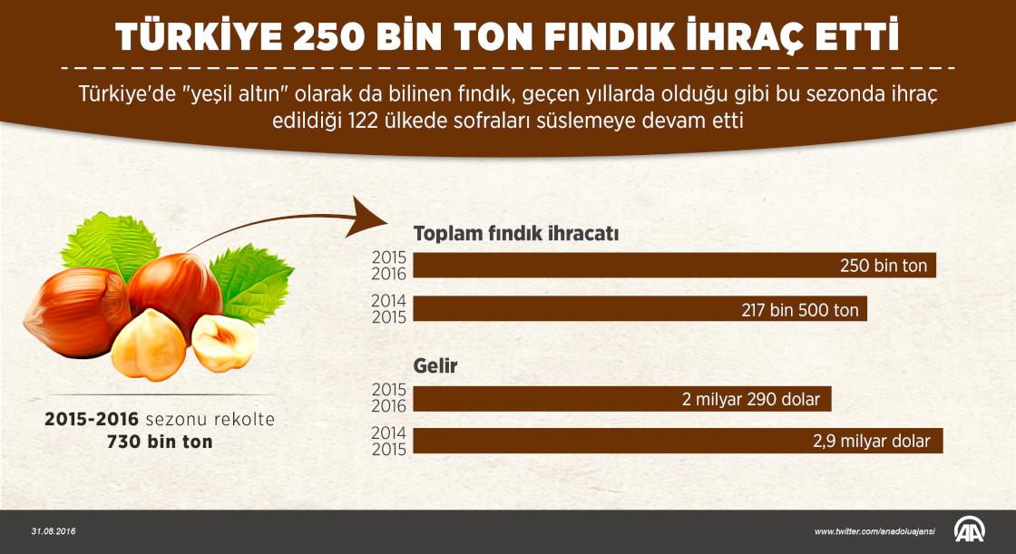 Dünya fındık üretim ve ihracatının büyük kısmını elinde bulunduran Türkiye, 2015-2016 fındık ihraç sezonunda 250 bin ton iç fındık ihracat etti. ( Muhammed Ali Yiğit - Anadolu Ajansı )