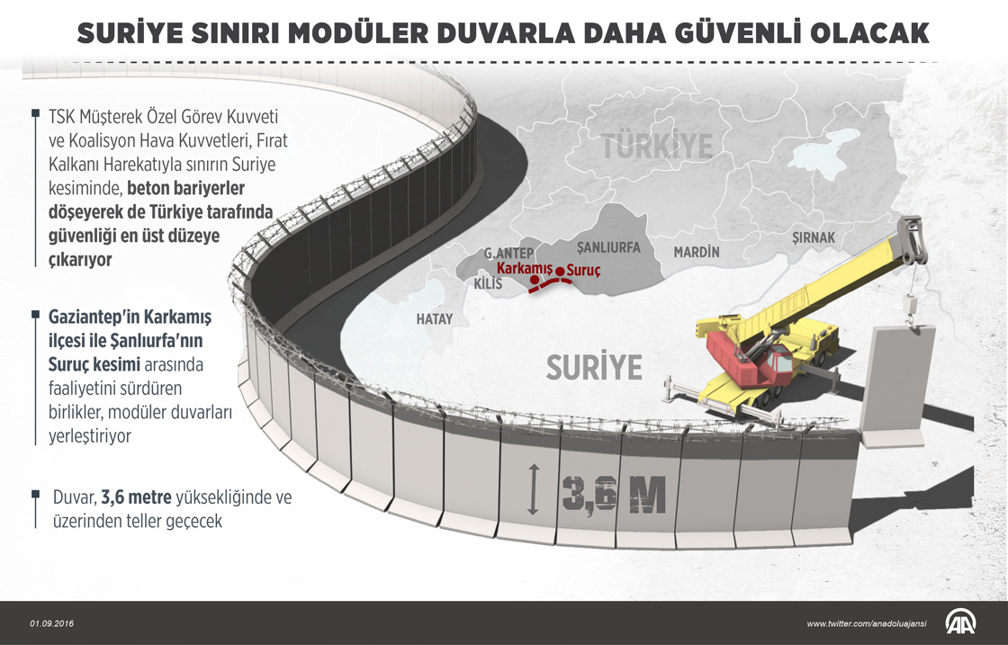 Türk Silahlı Kuvvetleri Müşterek Özel Görev Kuvveti ve Koalisyon Hava Kuvvetlerinin Fırat Kalkanı Harekatı'yla sınırın Suriye kesiminde, beton bariyerler döşenerek de Türkiye tarafında güvenlik en üst düzeye çıkarılıyor.
