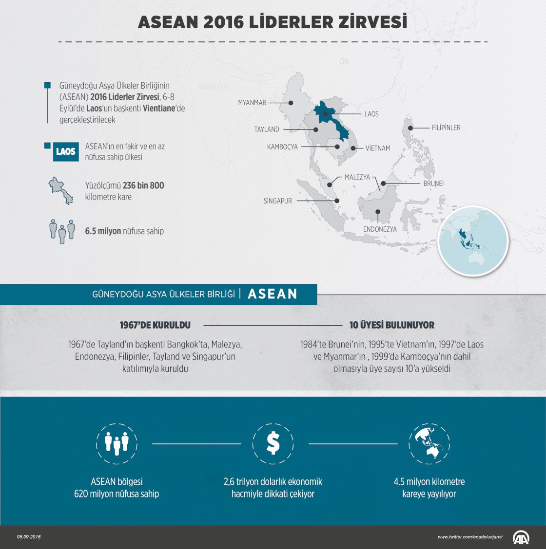 Güneydoğu Asya Ülkeler Birliğinin (ASEAN) 2016 Liderler Zirvesi, 6-8 Eylül’de Laos'un başkenti Vientiane'de gerçekleştirilecek. Zirvelerde, bölgesel güvenlik, ekonomi ve çevre gibi konuların yanı sıra ASEAN-Çin arasında yaşanan Güney Çin Denizi'ndeki egemenlik hakları meselesinin de ana gündem maddesi olması bekleniyor.Yaklaşık 6,5 milyon nüfusa sahip Laos Demokratik Halk Cumhuriyeti, ASEAN ülkeleri arasındaki en düşük nüfusa sahip ülke konumunda. Denize kıyısı bulunmayan 236 bin 800 kilometrekarelik alana sahip Laos, geçen yıl yüzde 7 büyüme hızıyla birlik üyeleri arasında büyüme oranı en yüksek ülke olmuştu. Laos, ASEAN'ın en fakir üyesi olarak da biliniyor. ( Ahmet Burak Özkan - Anadolu Ajansı )05 Eylül 2016•Güncelleme: 06 Eylül 2016