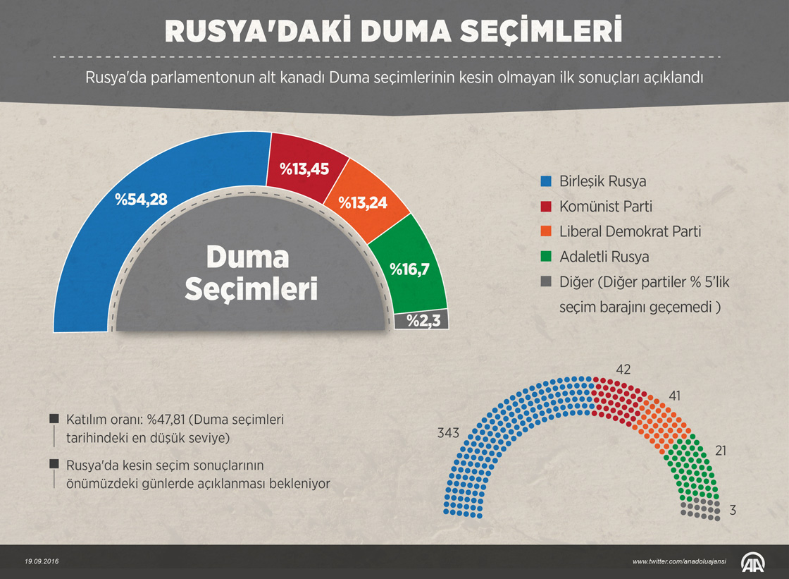 Rusya'da parlamentonun alt kanadı Duma seçimlerinin kesin olmayan ilk sonuçlarına göre Birleşik Rusya Partisi sandıktan birinci çıkarken, seçim barajını dört parti aşabildi. ( Muhammed Ali Yiğit - Anadolu Ajansı )