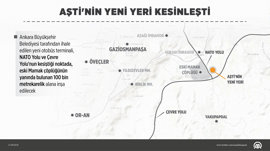Ankara Büyükşehir Belediyesi tarafından ihale edilen yeni otobüs terminali, NATO Yolu ve Çevre Yolu'nun kesiştiği noktada, eski Mamak çöplüğünün yanında bulunan 100 bin metrekarelik alana inşa edilecek. ( Ahmet Burak Özkan - Anadolu Ajansı )