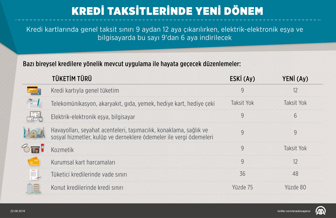 Kredi kartlarında genel taksit sınırı 9 aydan 12 aya çıkarılırken, elektrik-elektronik eşya ve bilgisayarda bu sayı 9'dan 6 aya indirilecek. ( Kemal Delikmen - Anadolu Ajansı )