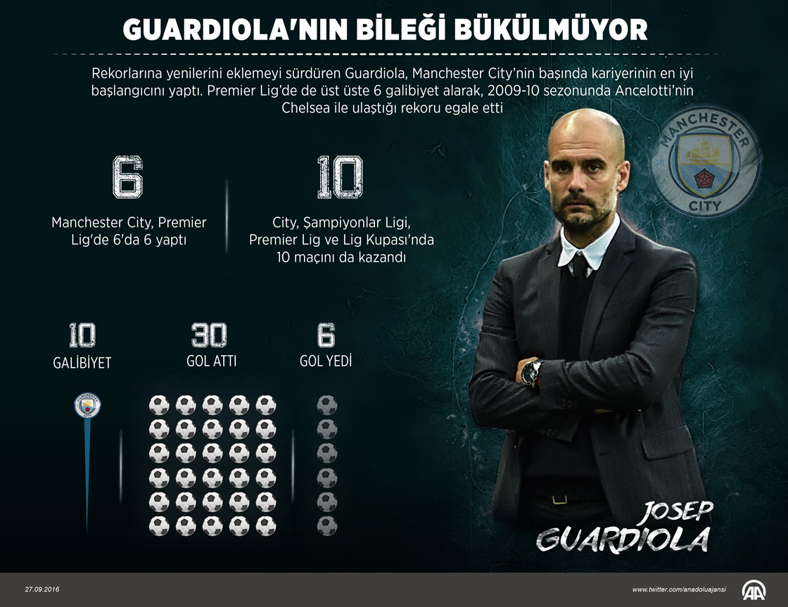 Rekorlarına yenilerini eklemeyi sürdüren Guardiola, Manchester City’nin başında kariyerinin en iyi başlangıcını yaptı. Premier Lig’de de üst üste 6 galibiyet alarak, 2009-10 sezonunda Ancelotti’nin Chelsea ile ulaştığı rekoru egale etti ( Grafik: Kemal Delikmen - Anadolu Ajansı )27 Eylül 2016•Güncelleme: 28 Eylül 2016
