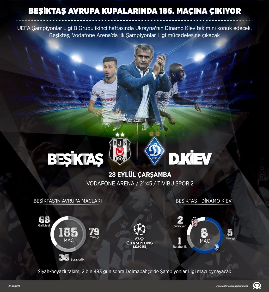UEFA Şampiyonlar Ligi B Grubu ikinci haftasında Ukrayna'nın Dinamo Kiev takımını konuk edecek. Beşiktaş, Vodafone Arena’da ilk Şampiyonlar Ligi mücadelesine çıkacak ( Grafik: Kemal Delikmen - Anadolu Ajansı )