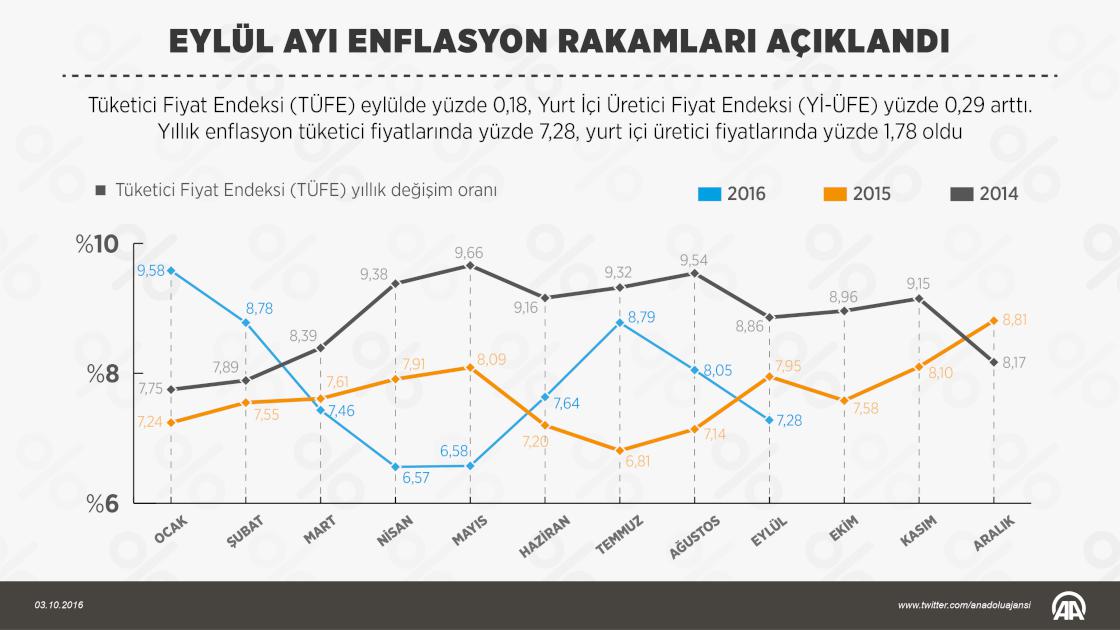 Tüketici Fiyat Endeksi (TÜFE) eylülde yüzde 0,18, Yurt İçi Üretici Fiyat Endeksi (Yİ-ÜFE) yüzde 0,29 arttı. Yıllık enflasyon tüketici fiyatlarında yüzde 7,28, yurt içi üretici fiyatlarında yüzde 1,78 oldu. ( Yasin Demirci - Anadolu Ajansı )